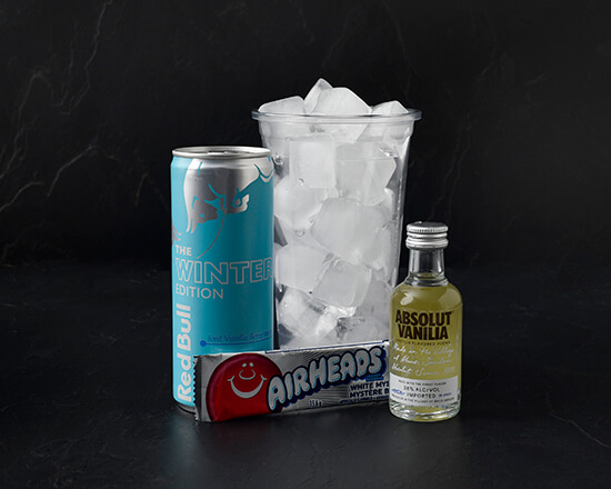 Vanilia flavoured vodka & Red Bull vanilia. Ice cup and candy included.